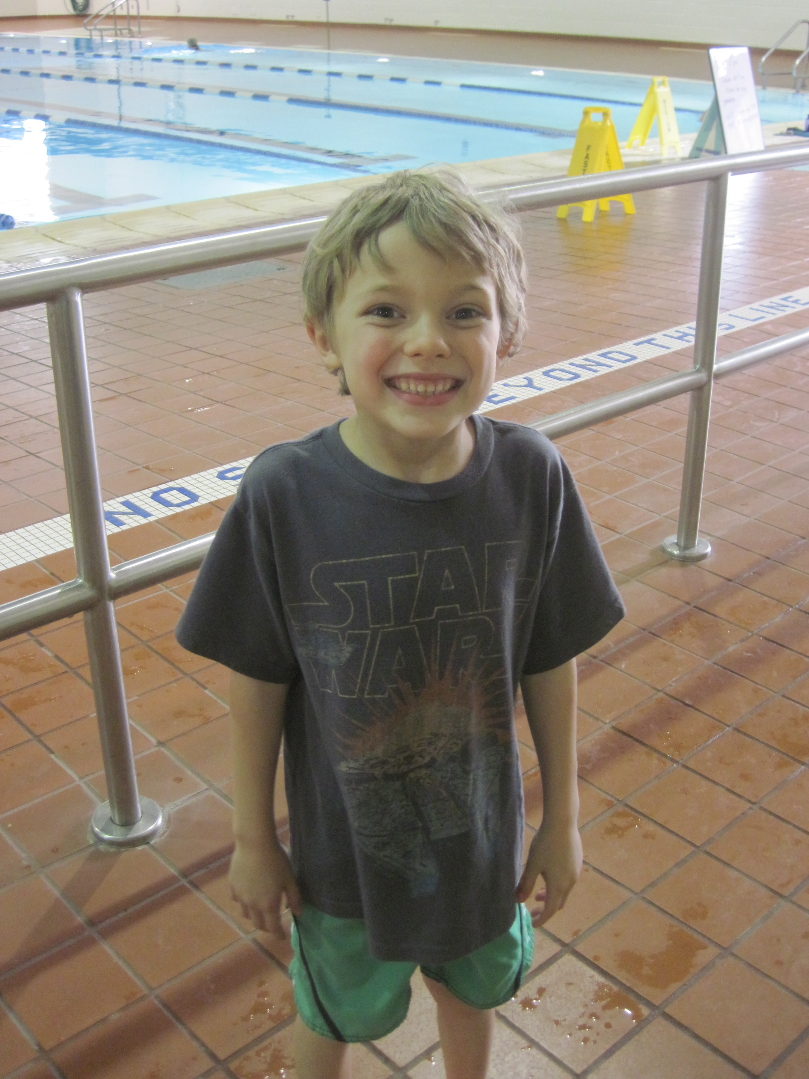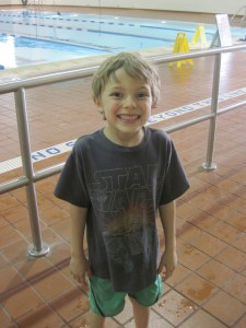 Parenting is definitely a hard balance between sacrificing everything for your children and selfishly keeping everything for yourself.  I struggle with both constantly, and I tend to go extreme on either end.  I need both running and yoga in my life, and I want Cole to have the same passion about something. After our Shamrock final-mile disaster, Cole, Christian and I had a long talk about Cole finding something he loves – drawing, running, basketball, swimming – I don’t care what it is, but I want him to feel proud of himself.  He told us that he really loves swimming. In fact, according to Cole, he loves swimming so much that he might have gills on his skin. Cole is a good swimmer under the water, but now he is ready to tackle learning to swim on top of the water.