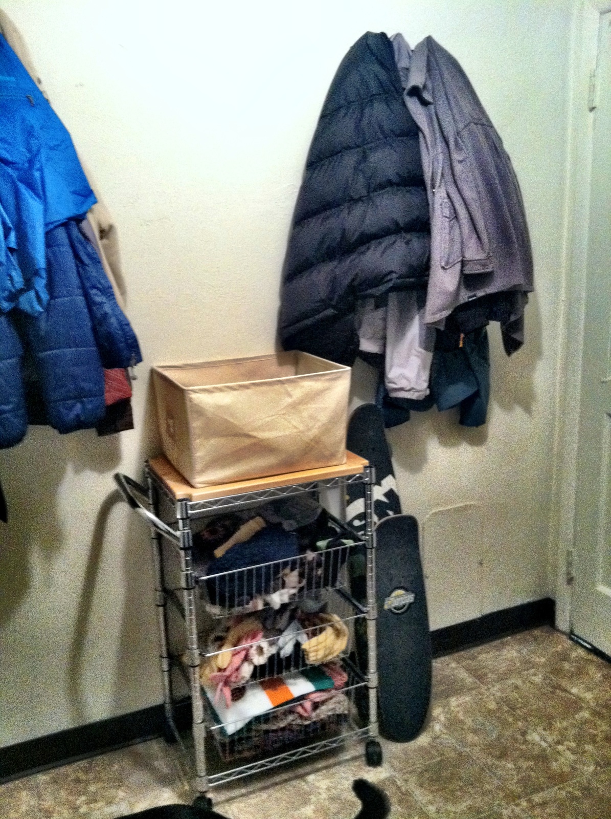 In the first “after” photo, we ditched the oversized Chi-Chi’s shelves (got to love a husband who sells liquor and gets tons of free crap!). In its placed, we moved in our old kitchen cart. We desperately needed a place to keep our winter attire. We have A LOT. It was all previous store in my laundry basket in the middle of the garage. The cart now holds it all. Top shelf – hats. Middle shelf – gloves. Bottom shelf – scarves. I love winter stuff!!! The top basket is for our everyday activity equipment – running and biking stuff. The jackets are all still up on the hooks, but they will be slowly making their way to an upstairs storage closet. I will also be adding a stand-up wrapping paper container to that area once I can find one. Who knew that it would be a hard item to locate?