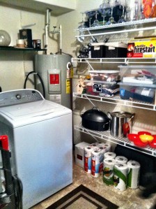 In the second “after” photo, I organized the four shelves. All I had to buy was 3 containers (5.99 each at bed, bath & beyond). The top shelf is our “party” shelf. It’s all the goodies for my annual taco night to benefit the American Cancer Society. The 2nd shelf has some random things from Alex’s leashes in a basket to extra wall hooks to fire logs. The 3rd shelf is all about school projects. The 4th shelf is for kitchen over flow. (Christian – please reference this blog when putting things away! Everything has a home! Let’s keep it that way!)