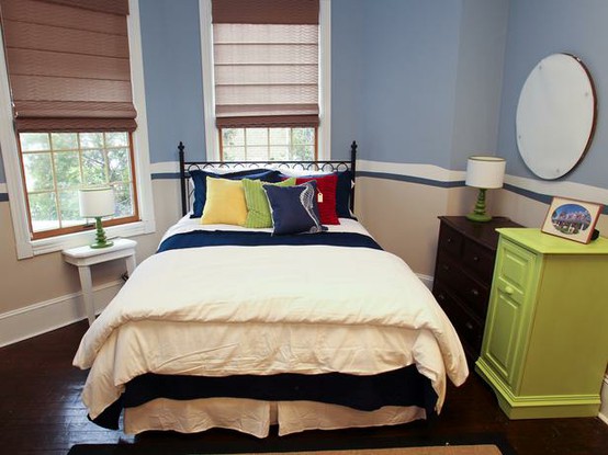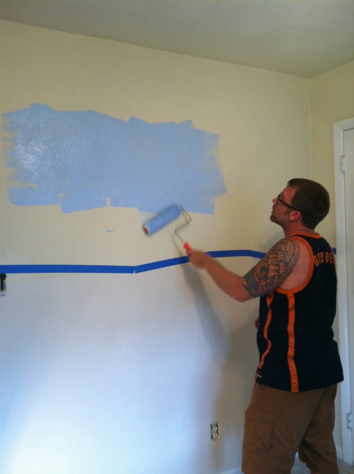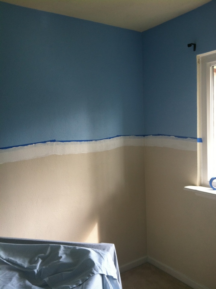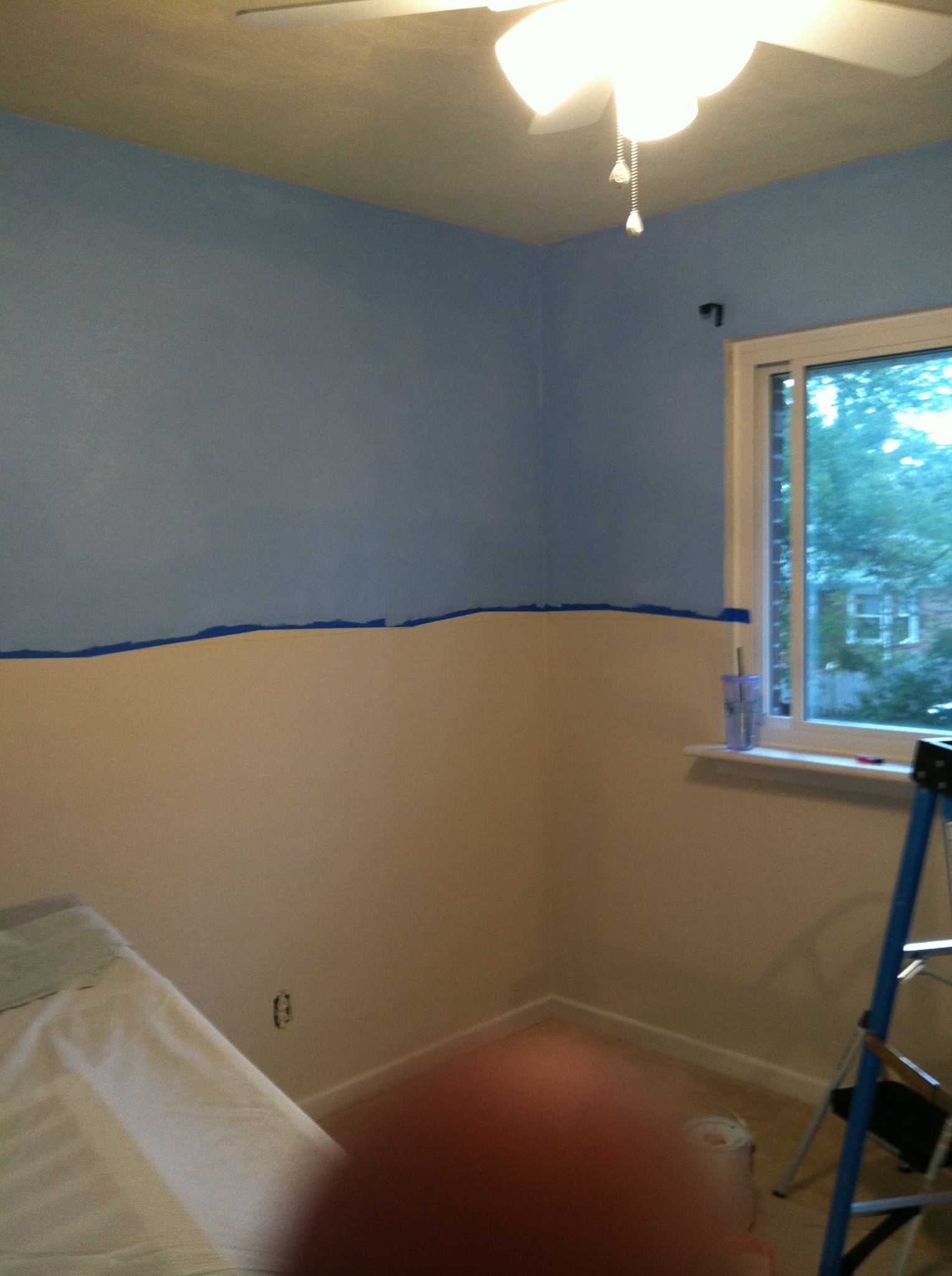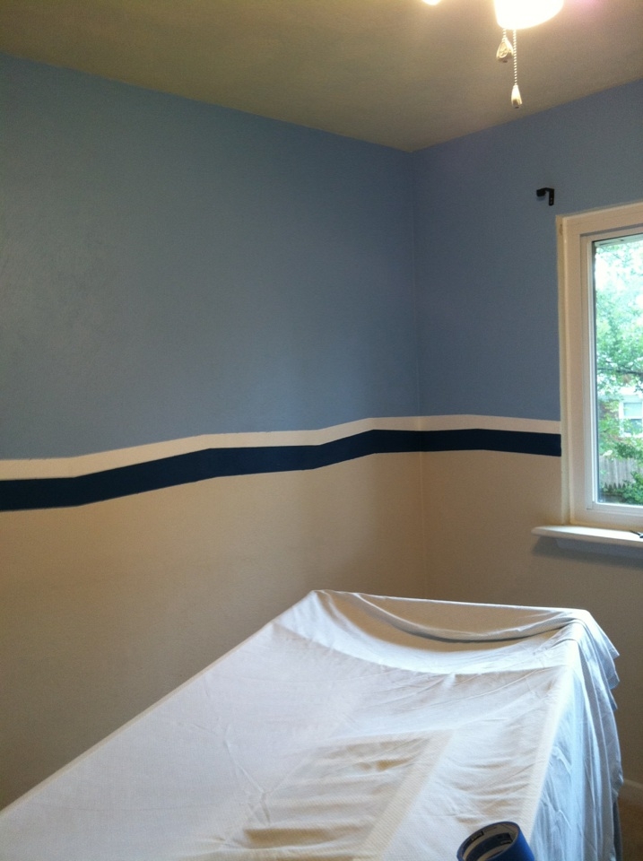 I still wasn’t sold on paint colors at this point. Was the blue too baby blue? I wanted crisp not pastel. There was no turning back. The entire room was now painted. All that was left was the two stripes around the center of the walls.