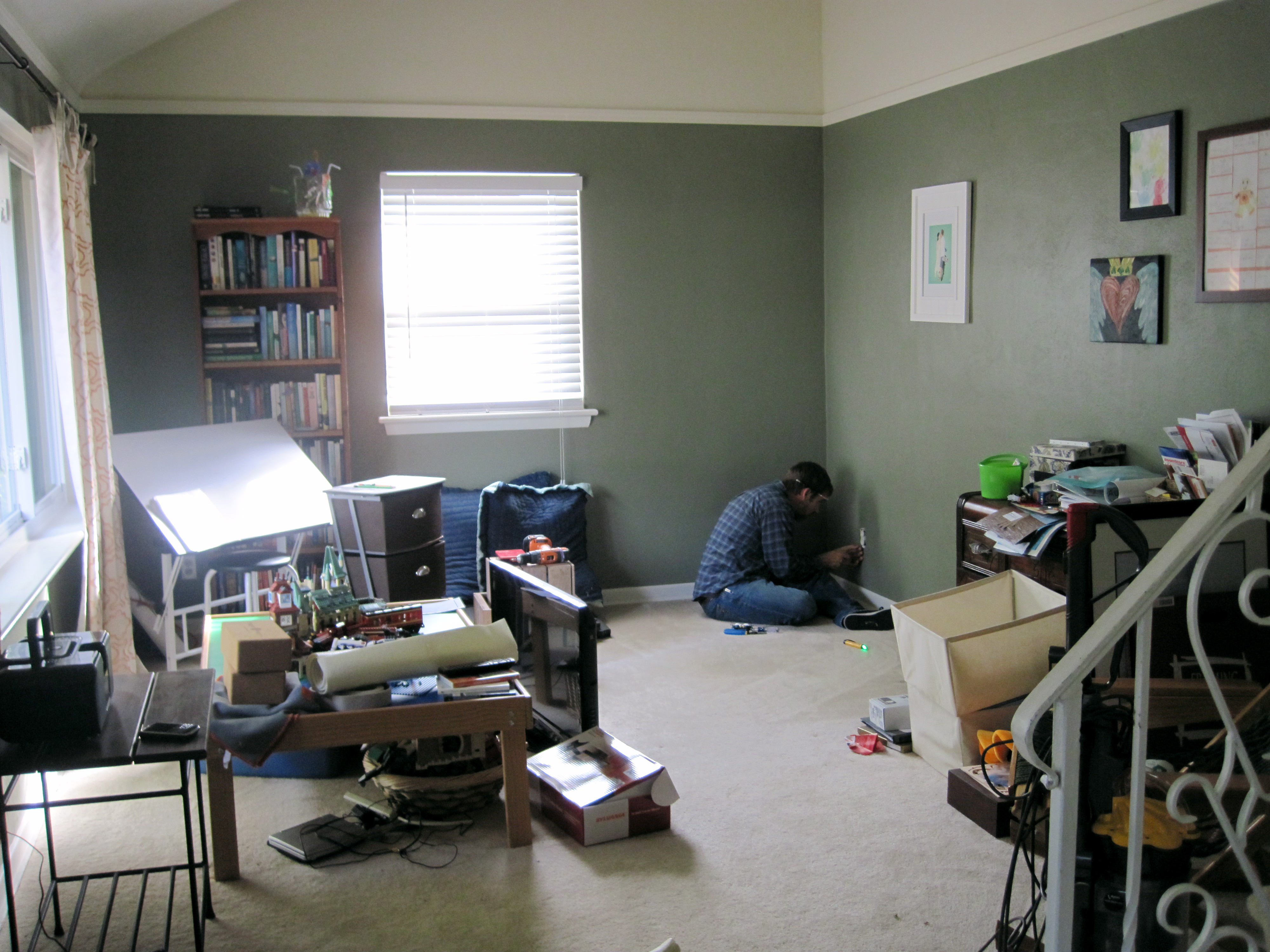 Our house is and probably always will be a constant work in progress. When we moved in to our house, the 3rd bedroom became a storage room, Christian’s closet, and part office. All of the clutter quickly got moved out once I found out I was pregnant. Christian’s clothes have been shifted to our bedroom and a hall closet. The office stuff joined the rest of the office stuff in our unused front room. The junk also found its way to the front room.  Chet’s room was officially ready to be a nursery.