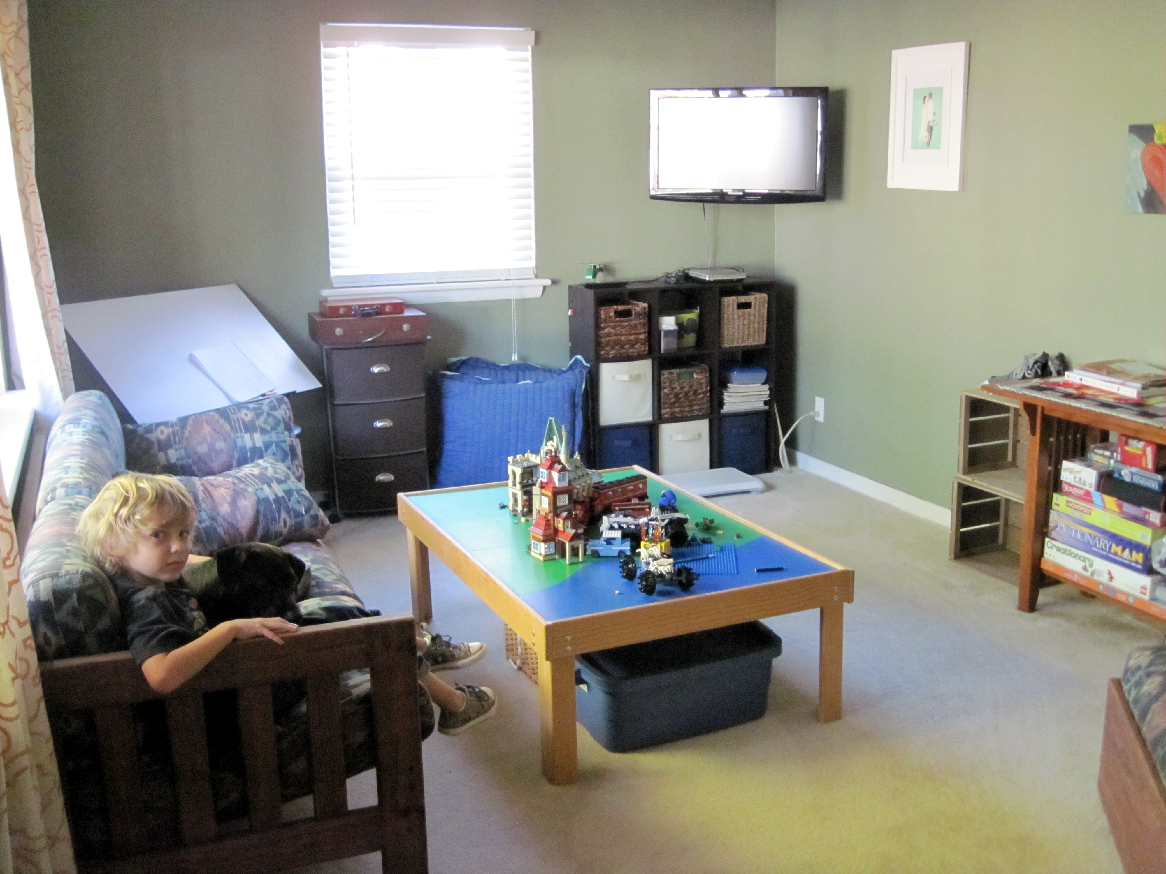 The benefits of giving up my dream yoga library for a family playroom has given me more peace than any yoga practice can offer. Cole now has a place to play with friends, play Wii, and be a crazy 7-year-old away from the rest of the family. I can watch Wheel of Fortune (yes! I watch it every night!) and he can build legos or play Pokémon. His friends can come over and I can sit on the couch without being in the middle of the play. What has me even more excited is what it will offer us in the next few months. The playroom is completely open to our kitchen. If I’m cooking, Chet can be in the play room and I’ll be able to see him. If I’m nursing Chet downstairs, Cole can escape to his playroom. If Chet is napping in the family room, Cole can be hyper in the playroom.