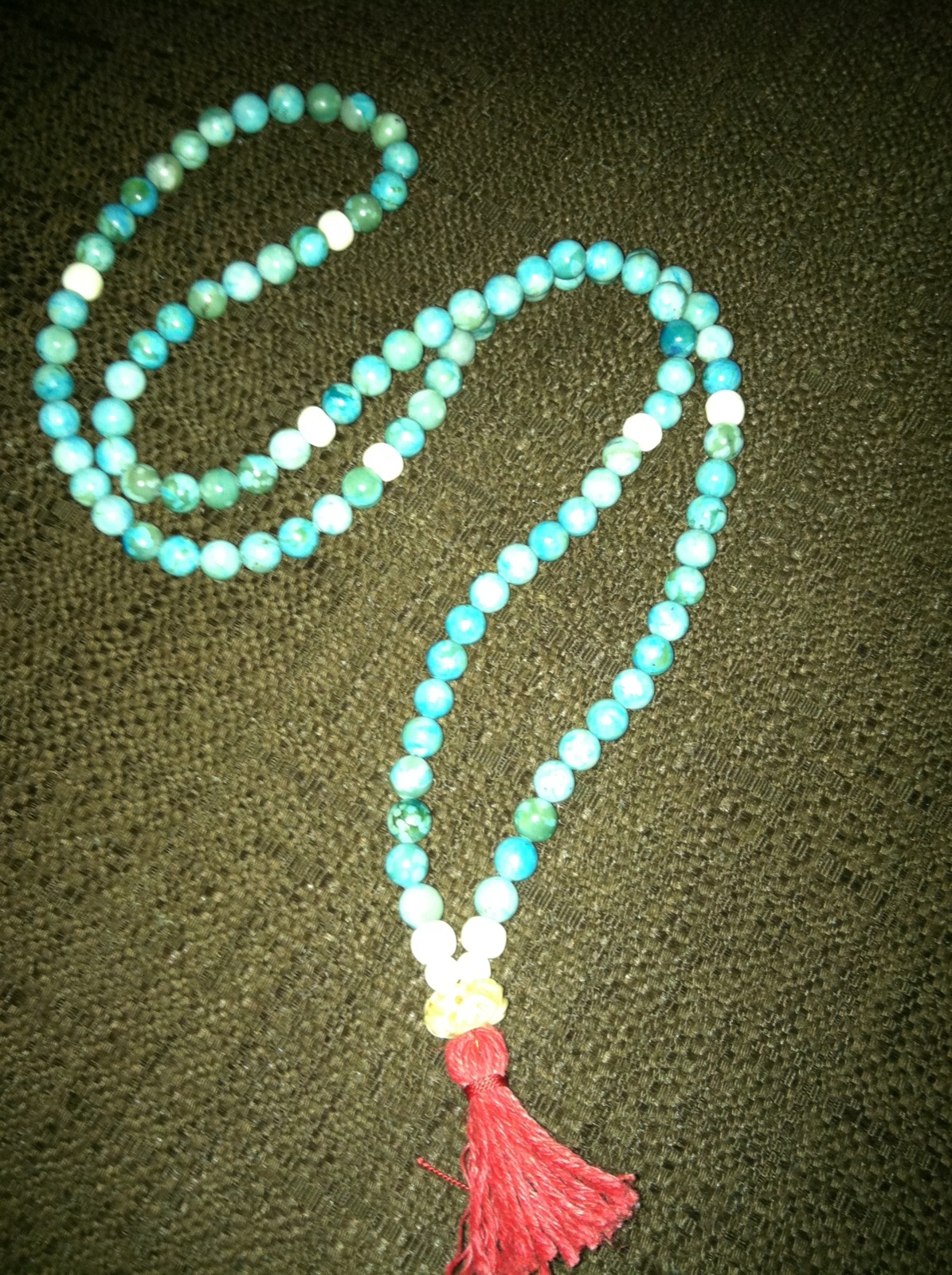 I have a feeling the year 2012 will be about defining openness in my life. To remind myself of this daily, I now own a turquoise, jasper, and bone full mala. Turquoise Jasper is a nurturing and peaceful stone that is said to promote gentleness, tranquility, comfort, wholeness, and healing. It is believed to stabilize and balance the emotions and is also known for its protective powers to drive away evil spirits. Not only do I love the meaning behind it, it is also beautiful. It feels so good to have a set around my neck again.