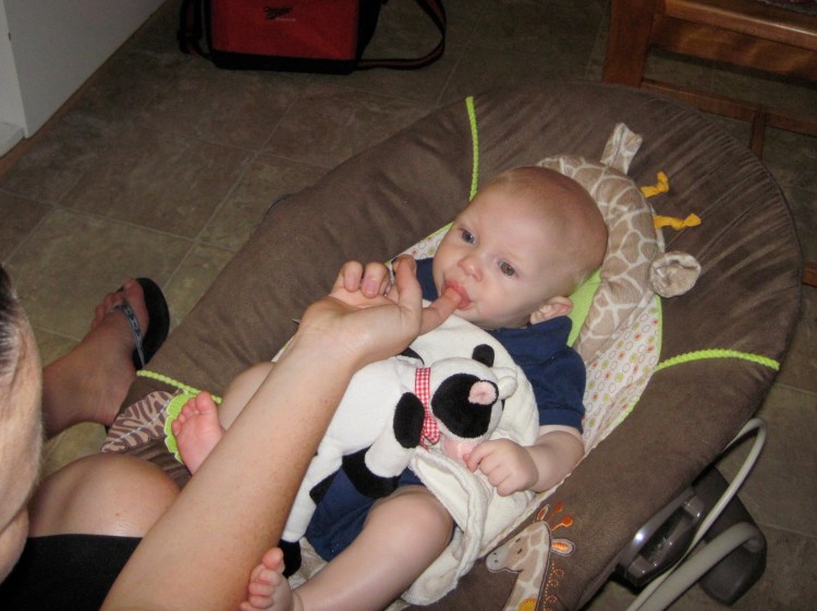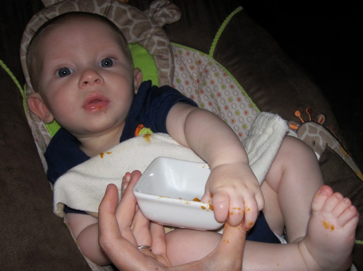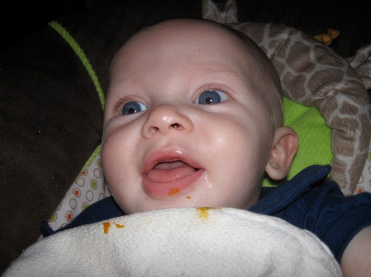 Tonight Chet was introduced to the wonderful world of sweet potatoes. I hadn’t planned on making this his first food. I wasn’t even planning on giving him food tonight. We were having sweet potatoes with our dinner, and Chet wanted them. I mashed up a small amount in a bowl, and we played. I feed him with my finger. He feed himself with his hands. His toes got in on the fun too. I made about a teaspoon size amount for him. Who knows how much made it into his mouth. It was absolutely wonderful watching him discover something new. We will continue to play with sweet potatoes for a while before we introduce squash and avocado.