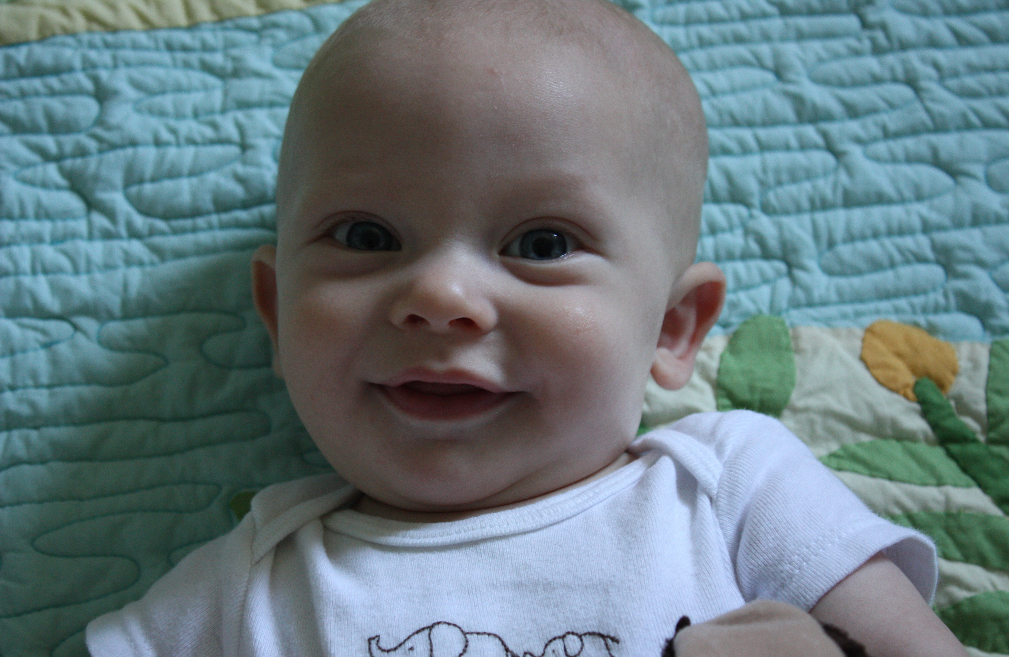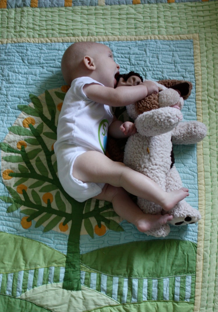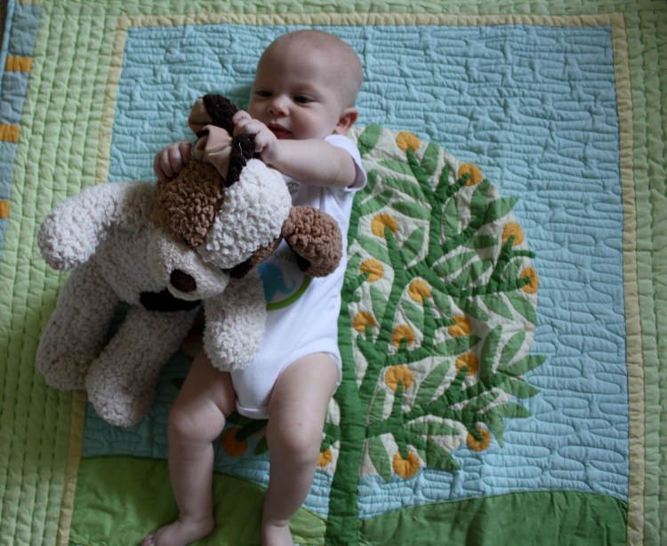 Chet’s personality is also starting to shine through. He is silly, goofy, and very talkative. He thinks his mama is funny. He loves to stare at his daddy. He is intrigued by his brother and his dog. He always puts on the sweetest smile when he sees his grandma in the morning. He adores his other grandma and both grandpas too. He belly laughs at every silly sound he hears. He has even started engage in conversations with us. He makes a noise. We mimic him. He repeats it. This goes back and forth all day long. He is also in love with the outdoors. He happily sits in his stroller on walks and runs. He hangs out with his grandma all day long. He is so content when he is outside.