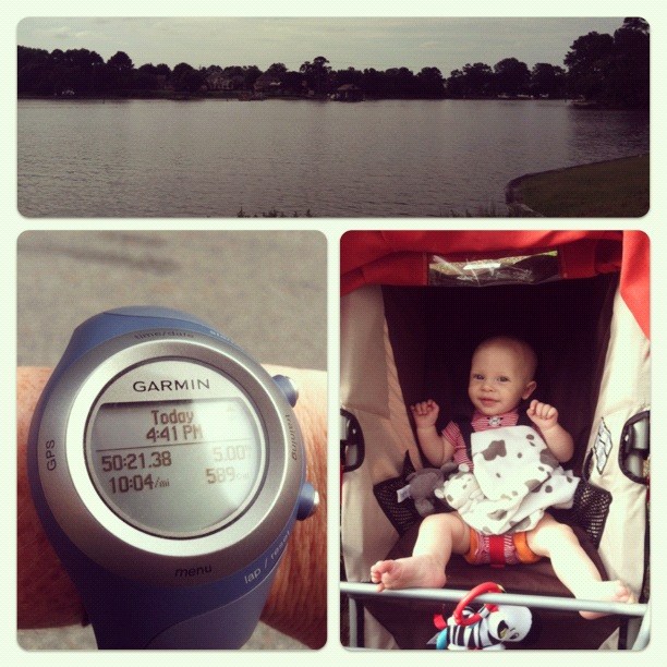 Mile 5 – My wonderful itty bitty running companion. I ran an extra mile for Chet. He absolutely loves being in the stroller with me on our runs. We chatted for the first 2 miles (he doesn’t talk back yet, but I know he wants too!). He slept for miles 3 and 4. And he enjoyed the ride for mile 5. 10:02 pace