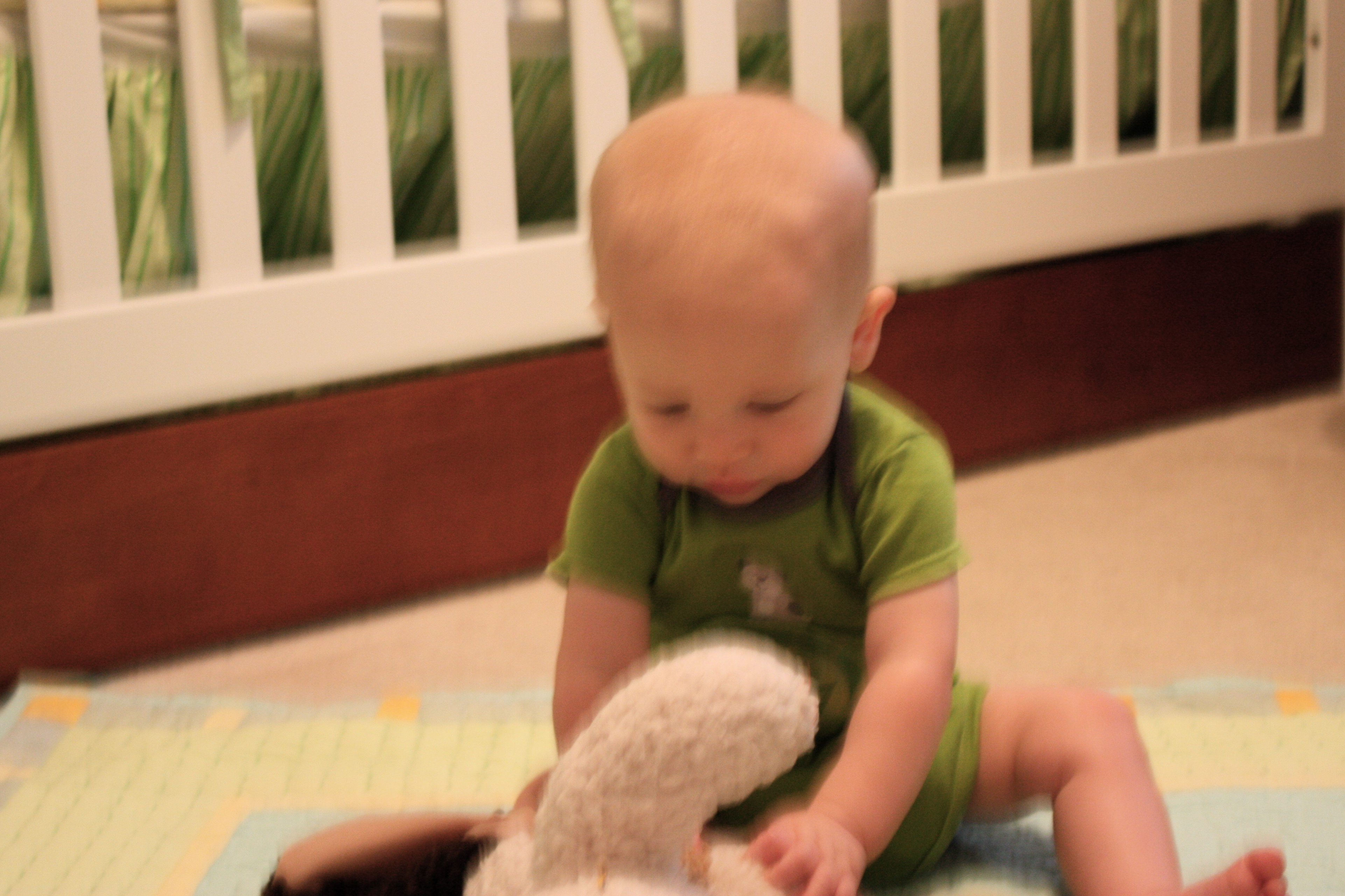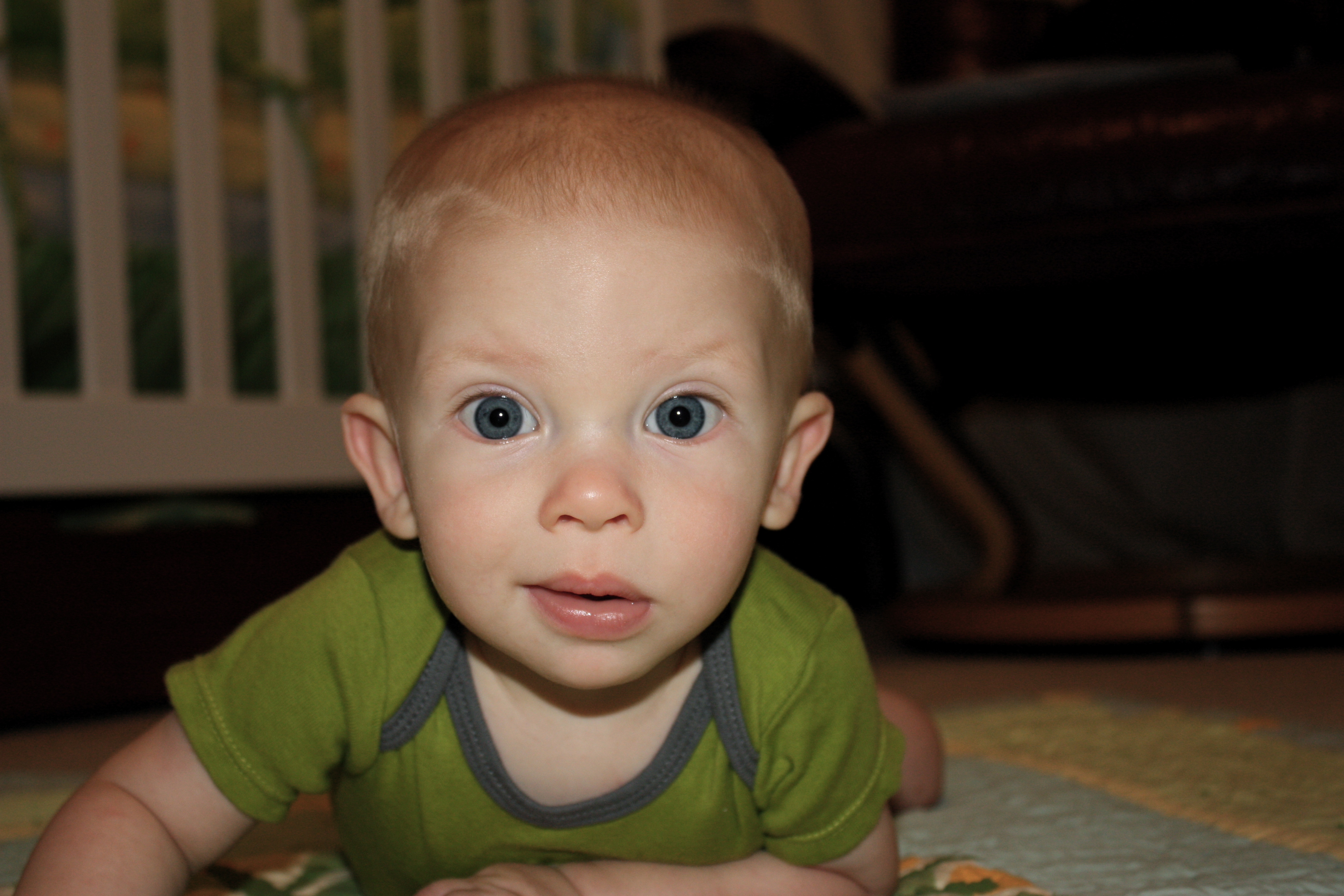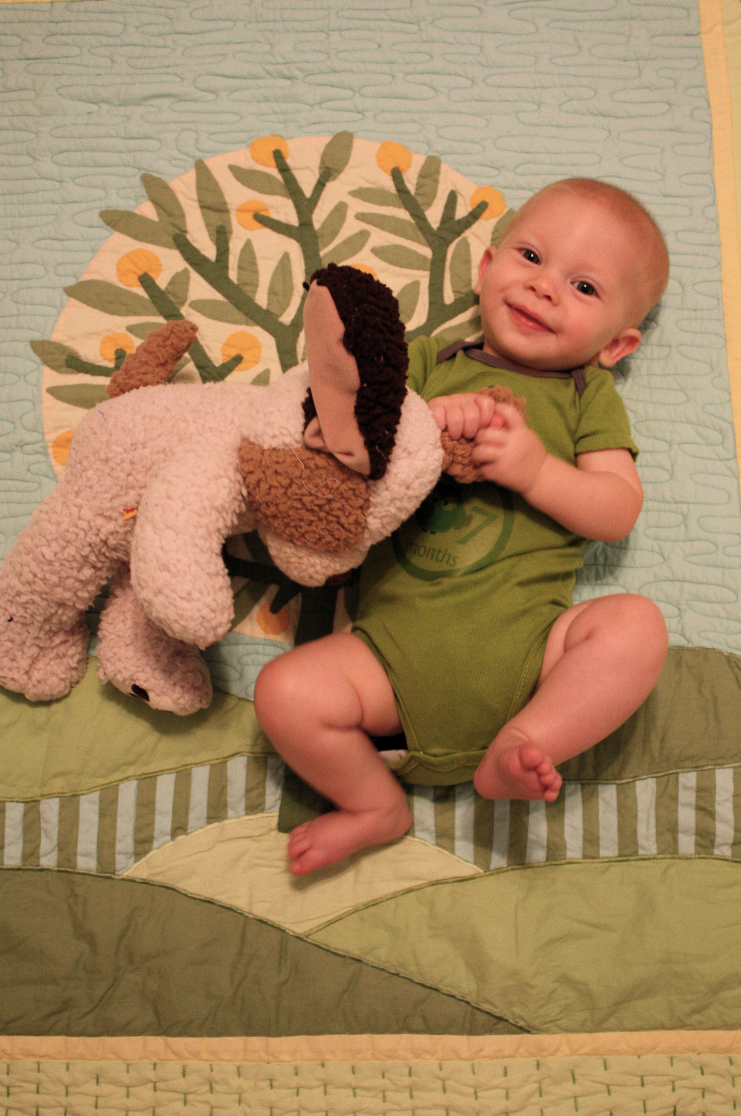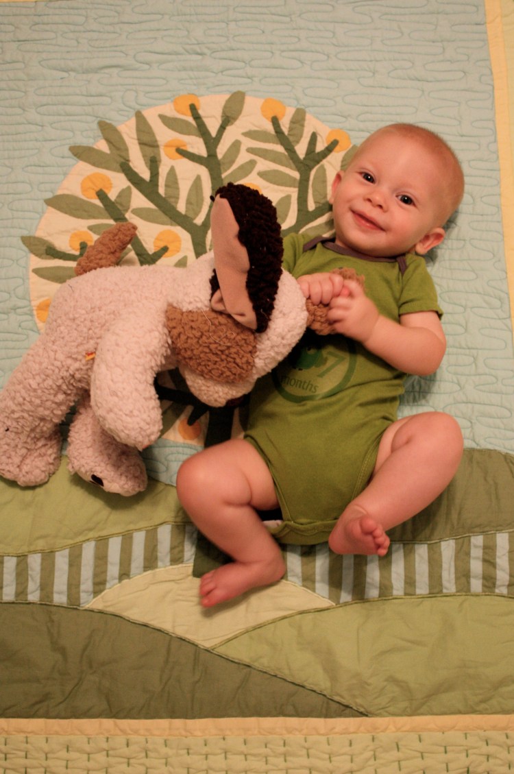 This month has been a challenging month in our house. Chet desperately wants to move, but still loves to hang out on my hip all day long. Can he learn to crawl from my arms? He gets frustrated. A lot. I can tell he is sick of being stuck on his back and rolling his way around the house. Just the past few days, he has really started to army crawl across the floor. His back-end and front-end are both working hard to crawl, he just can’t get both going at the same time yet. He’s also working on sitting. He can stay up right for a second or two (sometimes five) before he tips over.