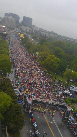 We woke up at 4:45am to heavy rain. We kept checking the weather forecast. Weather.com said 0% chance of rain in the 8 and 9 o’clock hour. Maybe we wouldn’t get soaked after all (They lied!). The rain progressively got worse as we drove to the start line. When we arrived at Centennial Park, the grounds were soaked. Puddles filled the streets. It was going to be a fun sloppy wet run. Lindsay and I lined up in our corral. It was cold. I tried to keep talking to keep race day nerves from getting the best of her. The race was about to officially start…