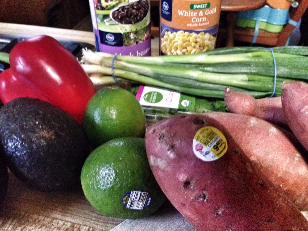 2. Cut the sweet potatoes into cubes and place in a large bowl. With a sharp knife, remove the corn kernels from the cob. Add the corn to the bowl. Stir in black beans, red pepper, green onions, cilantro, and avocado. Squeeze the lime juice over the salad and stir until combined. Season with salt and pepper, to taste. Serve.
