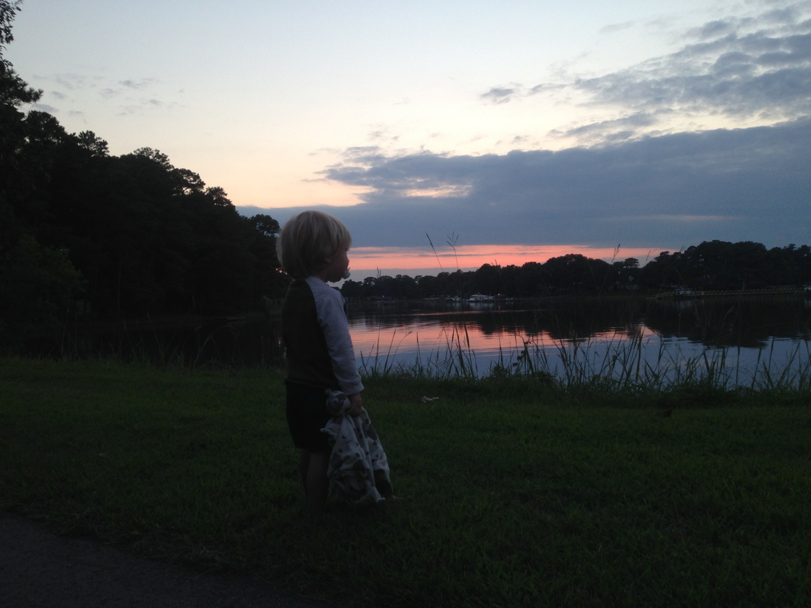 We missed the sunset, but the river was still waiting. I always let Chet run with me for the few blocks along the river. We bird watch. We check out the crane that is building the new boat ramp. After some begging and pleading (and protesting), he returns to his stroller (or tractor or lawn mower or dinosaur – whatever his imagination determines each night) to take the long way home.