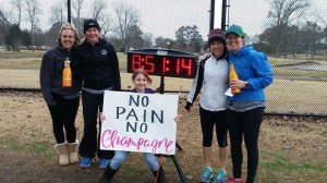 Round and round we ran. On Sunday, I joined forces with three badass ladies to make up Team NoPainNoChampagne at the Virginia Distance Series 100k Relay. For 62 miles, we ran loops on a 2.3 mile path around a golf course. The day started well before dawn, and it got colder and windier as the day got later.