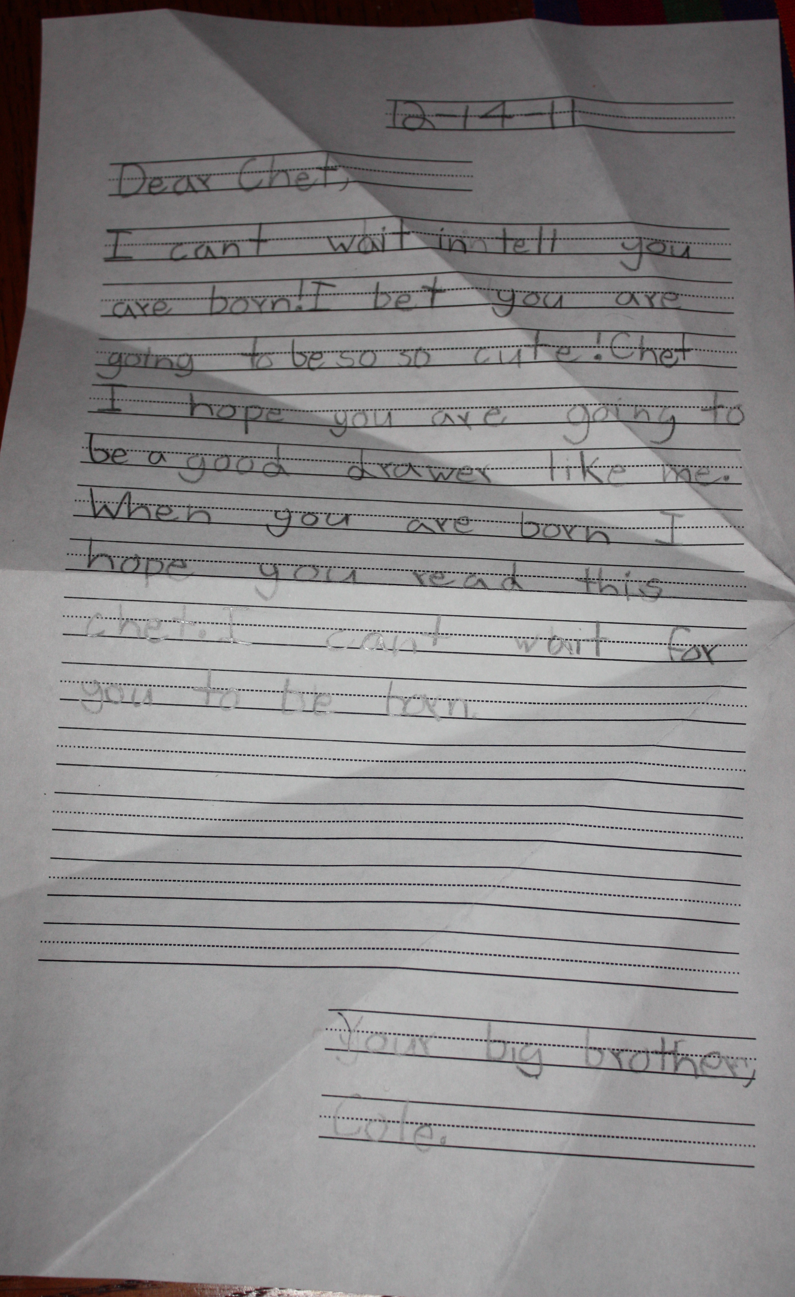 I cant wait in tell you are born! I bet you are going to be so so cute! Chet I hope you are going to be a good drawer like me. When you are born I hope you read this Chet. I cant wait for you to be born.